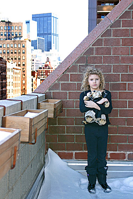 2/04 Adina, 6, on the terrace of her apartment only blocks from Ground Zero, where there is now a hole in the sky above her where the Twin Towers once stood.