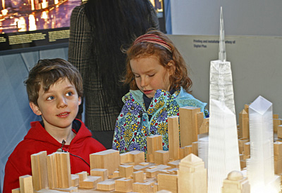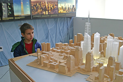 5/04 Loyan Beausoleil with Gale, 7, and Leo, 6, viewing the large model of the new World Trade Center at The Center for Architecture. Gale and Leo witnessed the first plane attack only three blocks from Ground Zero.